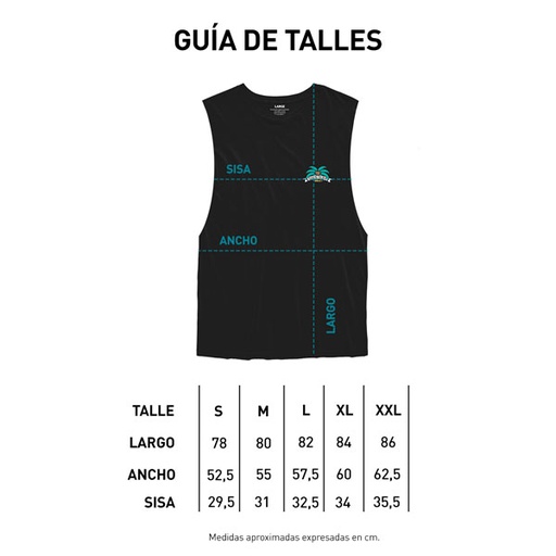 ◦ Remera sin manga. ◦ Jersey 24/1 esmerilado. ◦ Composición 50% algodón 50% poliester. ◦ Cuello redondo de ribb tejido 1x1 al tono. ◦ Estampa con base aquosa. ◦ Etiquetas tejida de marca. ◦ Back de talle estampado.
